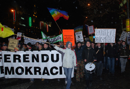 捷克各地爆发多次示威游行,反对美国在捷克领土上建立雷达基地。图为去年11月17日2000多民众走上布拉格街头抗议政府拒绝听从民意,继续与华盛顿谈判导弹基地协定。(资料图片 摄影 黄频)