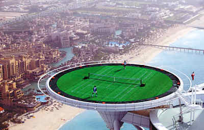据迪拜朋友讲,入住酒店的客人,一出迪拜机场就有酒店提供的两种“豪华选择”:坐劳斯莱斯豪华轿车过去,或是乘直升机。乘机前往的话,在15分钟的航程里,可以从高空鸟瞰迪拜市容,然后徐徐降落在酒店28层的直升机停机坪上。当然,这种高档享受是要付出高昂代价的。在酒店的楼顶,还有一个世界独一无二的“空中网球场”,它由直升机停机坪改建而成,距地面300多米。著名的网球选手费德勒和阿加西,就曾为备战迪拜男子网球公开赛,在这里打过友谊赛。