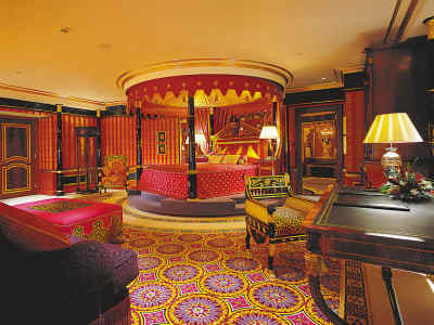 皇家套房大得吓人,足有780平米,摊开来的话,面积相当于两个篮球场。套房的设备更让人咂舌,里面竟然有私家电梯和泳池。屋里的摆设都是世界各地的珍宝,睡床还能旋转。让人叫绝的是卧房的天花板上,装有一面与睡床相映成像的大镜子。