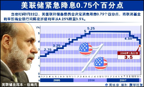 当天纽约股市开盘前,美联储宣布紧急降息0.75个百分点,将联邦基金利率从4.25%降至3.50%。不过,由于全球股市大幅走低,而当天纽约股市休市,纽约股市22日开盘后呈现补跌行情,道琼斯30种工业股票平均价格指数一度下跌近465点。此后,在美联储大幅降息的鼓舞下,市场逐渐回稳。