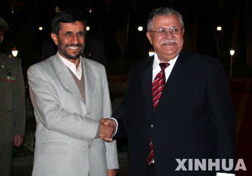 资料图片:2006年11月27日,伊朗总统艾哈迈迪-内贾德(左)在德黑兰的总统府举行仪式,欢迎来访的伊拉克总统塔拉巴尼。新华社记者梁有昶摄