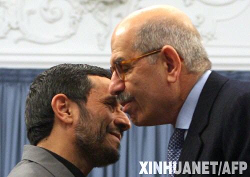 1月12日,伊朗总统艾哈迈迪-内贾德(左)在首都德黑兰与到访的国际原子能机构总干事巴拉迪会谈前相互致意。巴拉迪11日率代表团抵达德黑兰对伊朗进行为期两天的访问,这是他自2006年4月以来首次访伊。巴拉迪呼吁伊朗当局在核问题上“加速”同该机构的合作步伐,同时希望伊朗的核活动“更加透明”。 新华社/法新