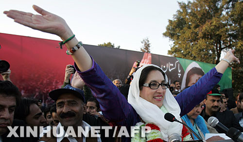 2007年12月27日,巴基斯坦前总理贝·布托在拉瓦尔品第参加竞选集会。贝·布托在当天举行的这个竞选集会上遭炸弹袭击身亡。 新华社/法新