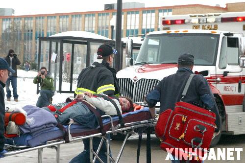 2月14日,在美国伊利诺伊州迪卡尔布县的北伊利诺伊大学,救援人员从枪击现场抬出一名受害者。当日,这所大学内发生枪击事件,造成10多人中枪,其中3至4人头部受伤。 新华社发