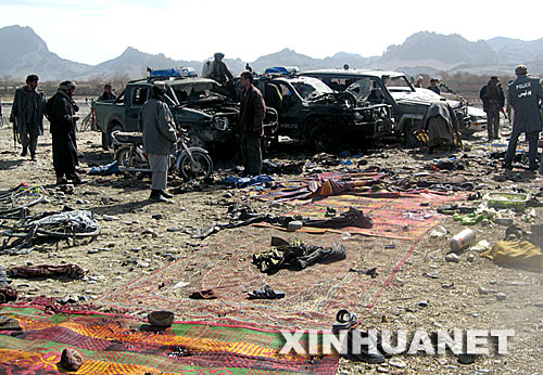 2月17日,警察和路人在阿富汗南部坎大哈市的爆炸袭击现场查看。坎大哈省省长阿萨杜拉·哈立德说,当天上午发生在坎大哈市一个斗狗场的爆炸是自杀式袭击事件,已经造成至少80人死亡。 新华社/法新