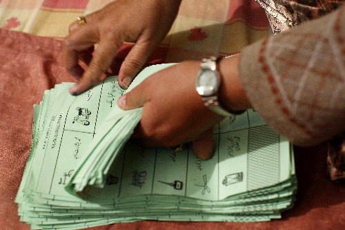 2月18日,在巴基斯坦拉瓦尔品第市的一个投票站内,工作人员在登记选票。巴基斯坦议会选举投票当地时间18日17时(北京时间20时)正式结束,各投票站工作人员开始计票工作。 新华社记者才扬摄