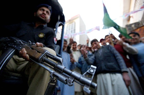 2月18日,在巴基斯坦拉瓦尔品第市的一个投票站外,安全人员正在警戒。巴基斯坦议会选举投票当地时间18日17时(北京时间20时)正式结束,各投票站工作人员开始计票工作。 新华社记者才扬摄
