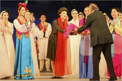 2月25日,朝鲜在万寿台艺术剧场举办盛大演出欢迎美国纽约爱乐乐团来访。