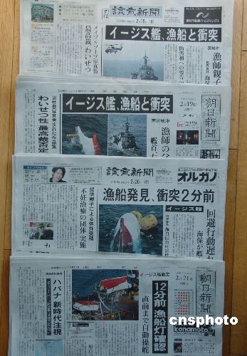 图为19日至21日的合计发行量近2000万份的《读卖新闻》和《朝日新闻》的头版头条报道。2月19日发生的日本宙斯盾军舰撞沉渔船的事故在日本政界引发了轩然大波,在野党纷纷质疑拥有“世界上最先进的雷达系统”的军舰为何突然不灵了,而首相福田则可能因此再次遭受新的打击。 中新社发 段跃中 摄