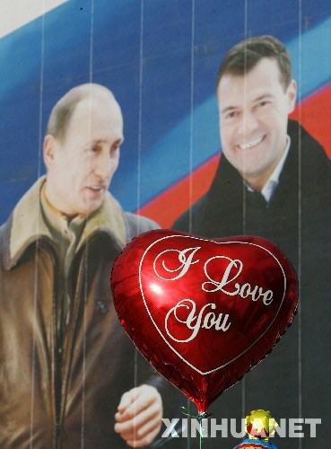 3月1日,在俄罗斯首都莫斯科市中心,一只气球飞过俄总统候选人梅德韦杰夫的竞选宣传画。3月2日,俄罗斯将举行总统选举投票。 新华社记者沈伯韩摄