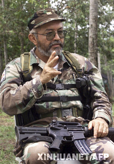 3月1日,哥伦比亚国防部人士证实哥最大反政府游击组织“哥伦比亚革命武装力量”的第二号人物劳尔·雷耶斯当天清晨在哥南部的普图马约省被政府军打死。图为劳尔·雷耶斯接受路透社采访的资料照片(摄于2001年5月13日)。 新华社/法新