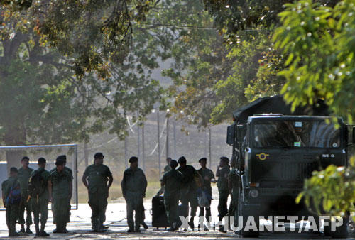 3月2日,在委内瑞拉首都加拉加斯以西约100公里的马拉凯,委内瑞拉士兵驻扎在营地内。当天,委内瑞拉总统乌戈·查韦斯下令关闭委内瑞拉驻哥伦比亚使馆,撤出委内瑞拉驻哥伦比亚使馆的外交人员,并派兵前往委内瑞拉与哥伦比亚两国边境。 新华社/法新
