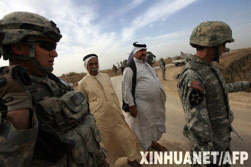 3月10日,在伊拉克迪亚拉省一个村庄的郊外,当地部落首领和美军士兵查看一处路上埋有简易爆炸装置的地点。驻伊拉克美军当日宣布,5名美军士兵当天在巴格达遭遇炸弹袭击身亡。 新华社/法新