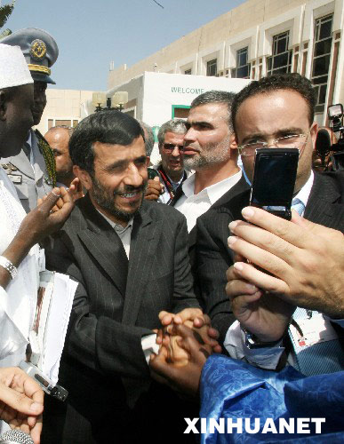 3月13日,在塞内加尔首都达喀尔举行的第11次伊斯兰国家首脑会议开幕式上,伊朗总统艾哈迈迪-内贾德(中)与支持者握手。 新华社记者王迎摄
