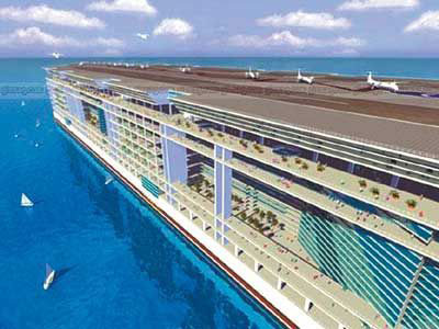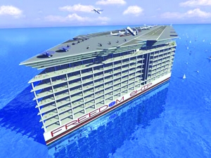 美国“自由之船国际公司”正打算建造一座史无前例的“世界最大的超级邮轮”——“自由之船”。它1400米长、37层楼高,个头相当于目前全球最大邮轮“玛丽女王二世”号的4倍。船上有多达1.8万套“海景房”、剧院、赌场、商业中心,甚至还有机场、学校和医院,可供6万人同时居住。事实上,“自由之船”的外形已不像任何一艘现有的巨型邮轮,倒更像是科幻小说中漂浮在海面上的“机器岛”——亿万富豪们可以常年“定居”在这座“海上城市”上,环绕世界各地海洋漂流!据设计师称,“自由之船”总造价估计高达110亿美元,有望在3年内完工。 |