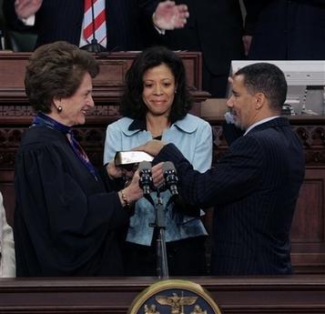 3月17日,大卫·帕特森在纽约州议会大厦携妻子米歇尔(中),宣誓就任州长。