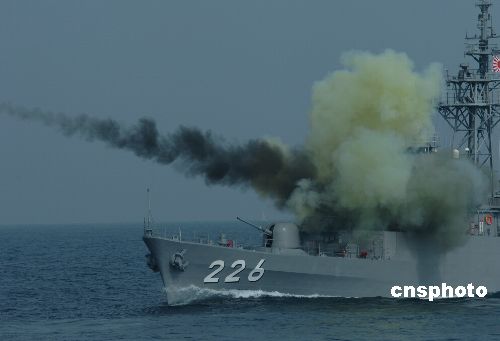 日本海上自卫队2006年十月二十九日在东京附近的相模湾海面举行阅兵仪式。图为相关舰艇演示发射反潜火箭弹。 中新社发 王健 摄