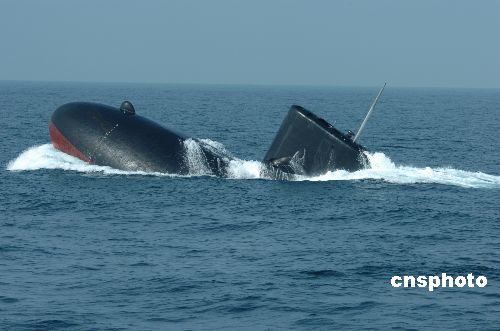 图为参加阅兵的二千吨级潜水艇演示紧急上浮。 中新社发 王健 摄