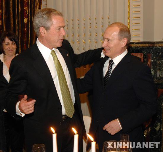 4月3日,美国总统布什(左)在罗马尼亚布加勒斯特与俄罗斯总统普京交谈。当天,布什和普京出席罗马尼亚总统伯塞斯库为前来参加北约峰会的政要举行的晚宴。 新华社/罗新社