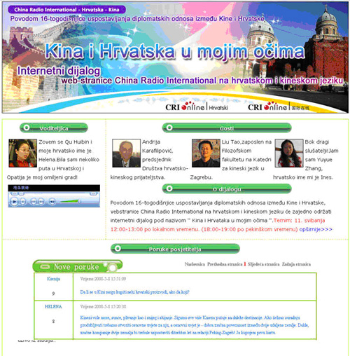国际在线消息:国际在线中文网和克罗地亚语网将于北京时间5月11日18:00至19:00联合推出主题为“相距不再遥远——我眼中的中国和克罗地亚”网络对话,这是国内首次在中克两国间采用网络方式进行的音频图文直播模式的访谈。