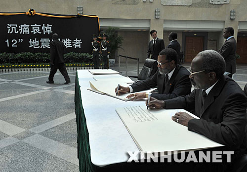 9时30分,来自世界五大洲的驻华使节和国际组织代表陆续抵达外交部,在吊唁簿上留言,向中国政府和人民表示深切同情和诚挚慰问,对地震中的罹难者表示沉痛哀悼。他们对中国政府、军队和人民在抗震救灾中表现出的英雄气概和付出的巨大努力表示钦佩,相信中国政府和人民必将战胜一切困难,重建美好家园。