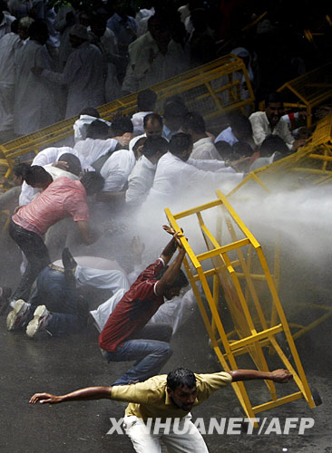 6月1日,在印度首都新德里街头,警察用水枪驱散参加抗议的古贾尔人。近期,拉贾斯坦邦古贾尔人要求调低自己的种姓级别,以便从政府的倾斜政策中获取更大利益。但政府对此予以拒绝。过去一周,该邦古贾尔人发动大规模抗议活动并与警察发生冲突。5月31日,声援印度拉贾斯坦邦古贾尔人的活动扩大到印度东北部地区。 新华社/法新