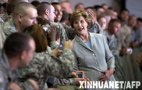 6月8日,在阿富汗巴格拉姆美军基地,美国第一夫人劳拉·布什(中)与美军士兵见面。布什夫人当日突访阿富汗,呼吁国际社会不要放弃这个饱受战争、暴力摧残的国家。 新华社/法新