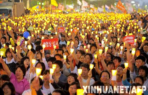 因进口美国牛肉而引发的韩国民众烛光示威已经持续40多天了,并且在10日晚达到高潮,参与人数规模创下纪录。随着活动持续升温,“牛肉风波”正演变为一场“清算”李明博政府失策乃至宣泄反美情绪的运动。示威主办方发出“最后通牒”,不重启牛肉谈判,将发动全面“倒李”运动。而随着直播烛光示威的视频网站逐渐增多,韩国市民开始熬夜观看,并出现“上瘾现象”。