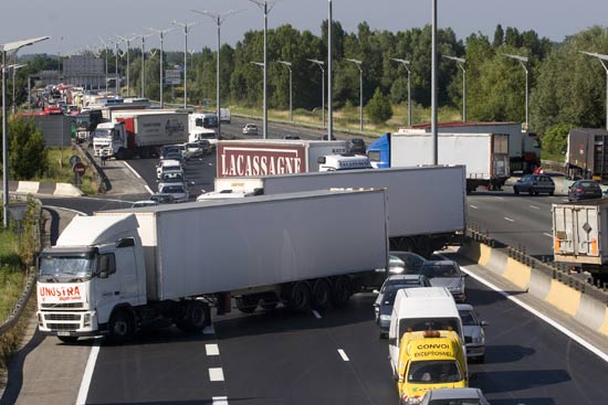 6月30日,在法国西南部的波尔多,一条环城公路被卡车堵塞。