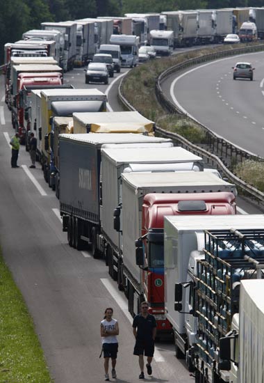 6月30日,在法国斯特拉斯堡附近,一条公路被卡车堵塞。