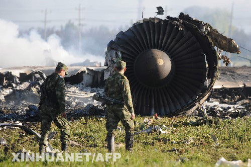 7月7日,在哥伦比亚的莫斯克拉,哥伦比亚空军人员在查看坠毁的美国波音747货机残骸。当天,这架美国波音747货机从哥伦比亚首都波哥大一机场起飞后不久撞上一座建筑并起火,造成建筑内2人死亡,所幸8名机组人员全部幸免于难。 新华社/法新