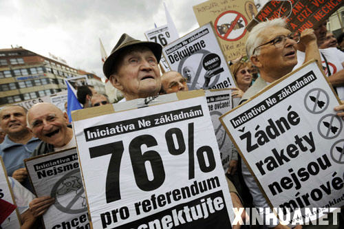 新华网布拉格7月8日电(记者孙希有)捷克“不要基地”倡议组织等8日在布拉格举行示威游行,抗议捷克政府和美国签署美在捷克建立反导雷达预警基地总协定。
