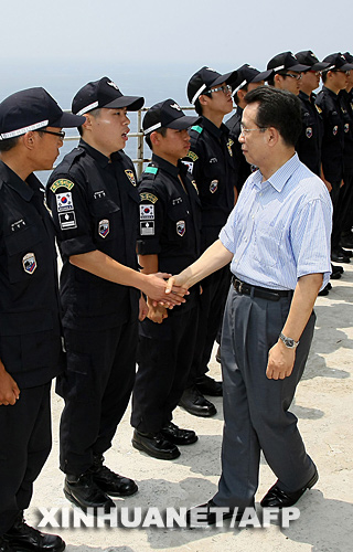 7月29日,韩国总理韩升洙在独岛(日本称“竹岛”)上慰问执行任务的警务人员。 新华社/法新