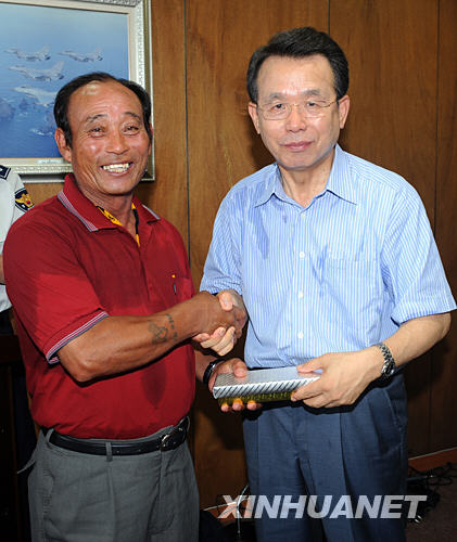 7月29日,韩国总理韩升洙(右)在位于韩国东部海域的独岛(日本称“竹岛”)看望岛上的居民。 新华社/纽西斯通讯社