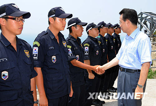 7月29日,韩国总理韩升洙(右)在位于韩国东部海域的独岛(日本称“竹岛”)上看望守岛的警务人员。 新华社/纽西斯通讯社
