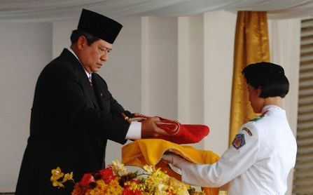 总统苏西洛将国旗递给一名旗手