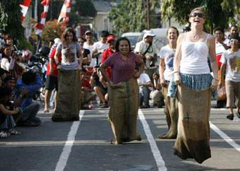 外国游客和当地老百姓一起进行套麻袋跑步比赛。