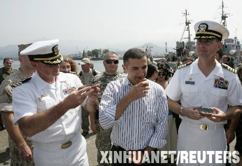 8月24日,在格鲁吉亚黑海港口巴统,格国防部长克泽拉什维利(中)欢迎美国海军导弹驱逐舰“麦克福尔”号舰长约翰·摩尔(右)和指挥官蒂莫西·肖尔(左)。当天,载有约80吨人道主义救援物资的“麦克福尔”号抵达格黑海港口巴统。 新华社/路透 |