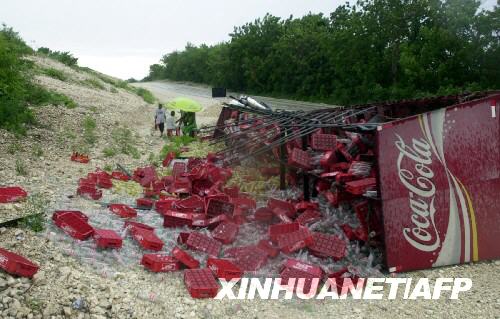 9月2日,在距离海地首都太子港约171公里的戈纳伊夫附近,人们在公路旁收拾因热带风暴“汉娜”翻倒的货车上的货物。热带风暴“汉娜”1日升级为飓风,2日减弱为热带风暴袭击海地,已在当地造成至少19人死亡。 新华社/法新