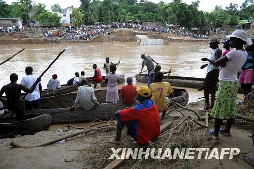 9月7日,在海地首都太子港东北地区60公里处的米勒巴莱,由于大桥被洪水冲毁,人们不得不准备乘船过河。新华社/法新