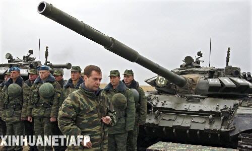 9月26日,俄罗斯总统梅德韦杰夫(前)在奥伦堡附近的一个军事试验场视察。当天,梅德韦杰夫在奥伦堡会见各军区司令时说,俄罗斯在2020年前将全面保障军队完成核遏制任务,并装备成套的最新式武器。 新华社/法新