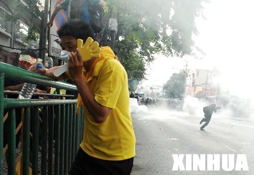 10月7日,在位于泰国首都曼谷的国会大院外,警方使用催泪瓦斯驱散反政府民间组织人民民主联盟(民盟)的集会者。民盟要求颂猜总理在当天18时之前解散国会下议院。警方使用催泪瓦斯驱散反政府示威者,现场发生严重的踩踏事件,已经造成数十人受伤。新华社记者凌朔摄