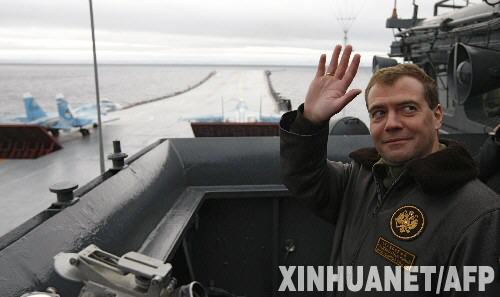 10月11日,俄罗斯总统梅德韦杰夫在巴伦支海海域观摩俄海军北方舰队军事演习时挥手致意。梅德韦杰夫当日在巴伦支海海域观摩了正在进行的代号为“德维纳”的俄海军北方舰队军事演习,演习中一艘核潜艇成功试射了一枚洲际弹道导弹。 新华社/法新