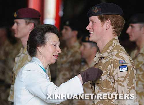 5月5日,英国哈里王子(前右)在温莎一个兵营接受安妮公主授予的服役勋章。据报道,哈里王子因在阿富汗前线的服役经历获得一枚勋章。 新华社/路透