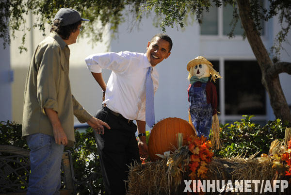 30日,在美国佛罗里达州的萨拉索塔,选战中四处奔走的美国民主党总统候选人奥巴马忙里偷闲,来到当地的一家南瓜园摘南瓜,享受片刻悠闲。 新华社/法新