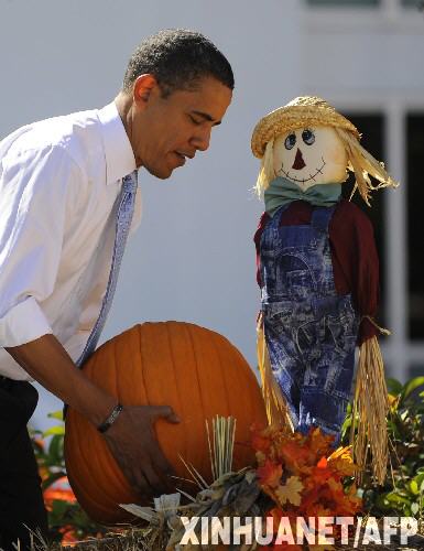 10月30日,在美国佛罗里达州的萨拉索塔,选战中四处奔走的美国民主党总统候选人奥巴马忙里偷闲,来到当地的一家南瓜园摘南瓜,享受片刻悠闲。 新华社/法新 |