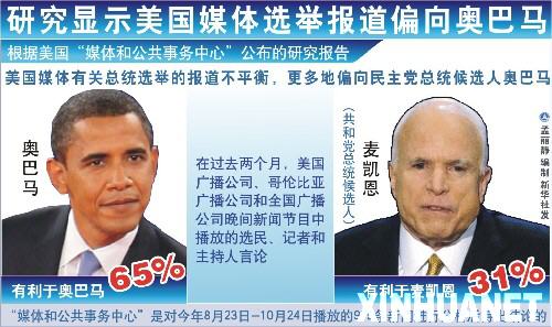 2008年11月1日 图表:研究显示美国媒体选举报道偏向奥巴马 新华社发