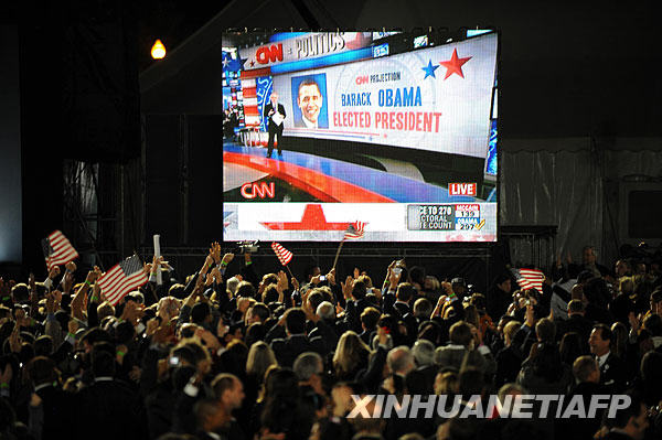 11月4日,在美国芝加哥格兰特公园,美国民主党总统候选人、伊利诺伊州国会参议员贝拉克·奥巴马的支持者欢呼庆祝。新华社/法新