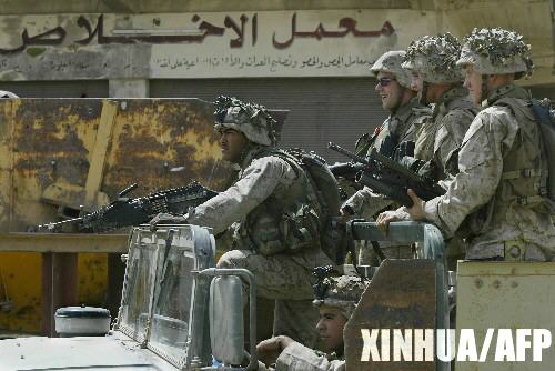 资料图片:几名美国海军陆战队士兵在伊拉克费卢杰街头乘车巡逻。 新华社/法新