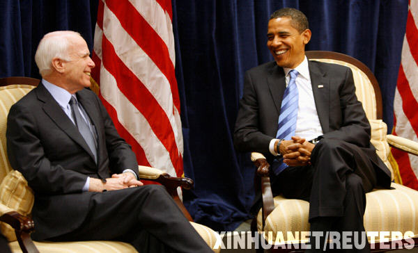 11月17日,美国当选总统奥巴马(右)与他在总统选举中的对手麦凯恩在芝加哥举行会谈。会后双方一致表示将携手合作,共同应对金融危机和美国面临的其他重大挑战。 新华社/路透